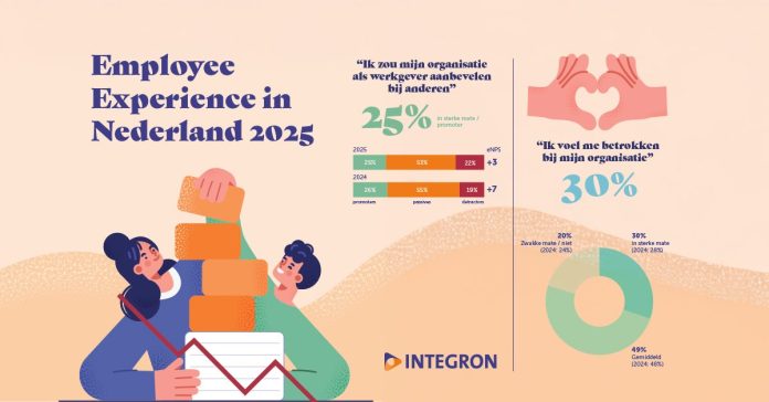 De beleving van werkend Nederland is op enkele vlakken vooruit gegaan. Medewerkers zijn meer betrokken bij hun organisatie. Verder is de sollicitatiedrang iets minder aanwezig. Mede omdat werkgevers de salarissen van medewerkers vaak hebben verhoogd. Toch daalt het enthousiasme over de werkgever. Zo zakt de employee Net Promoter Score (eNPS), dé graadmeter voor ‘medewerkers-enthousiasme’, naar +3. Vorig jaar was dat nog +7. Ook de werkdruk is voor 29% van de medewerkers te hoog, met gevolgen voor hun enthousiasme, betrokkenheid en verzuim. Bovendien is nog steeds 1 op de 3 medewerkers van plan om ergens anders aan de slag te gaan. Dit blijkt uit het Employee Experience 2025-onderzoek dat onderzoeks- en adviesbureau Integron jaarlijks uitvoert onder zo’n 5.000 deelnemers verdeeld over 13 branches.